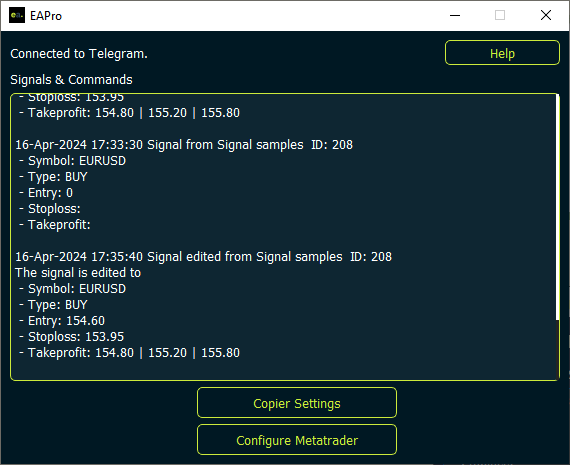 If a telegram message that contains a signal is edited, the system will send a signal update to MetaTrader 4 EA. Edits can be performed on entry price, stop loss price and take profit price. Entry price can only be updated in Pending orders. Stop loss and take profit edits will override existing stop loss and take profit levels of the trades. If the user chooses to skip this step, it can be done on the EA settings page.